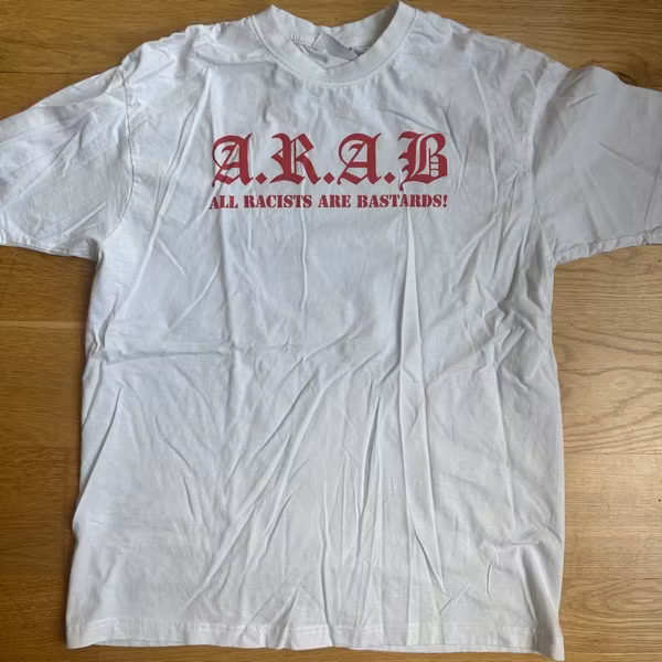 Home › CLOTHES, Merch › A.R.A.B All Racists Are Bastards! (M) (USED) T-SHIRT A.R.A.B All Racists Are Bastards! (M) (USED) T-SHIRT 0 kr 100 kr Sorry, this item is out of stock. Condition: Used (Worn and washed maybe once, looks great.)Size: MBrand: SlazengerShirt colour: WhiteBack print: No You'll probably like these as well SOM SOM (L) (USED) T-SHIRT 50 kr Info