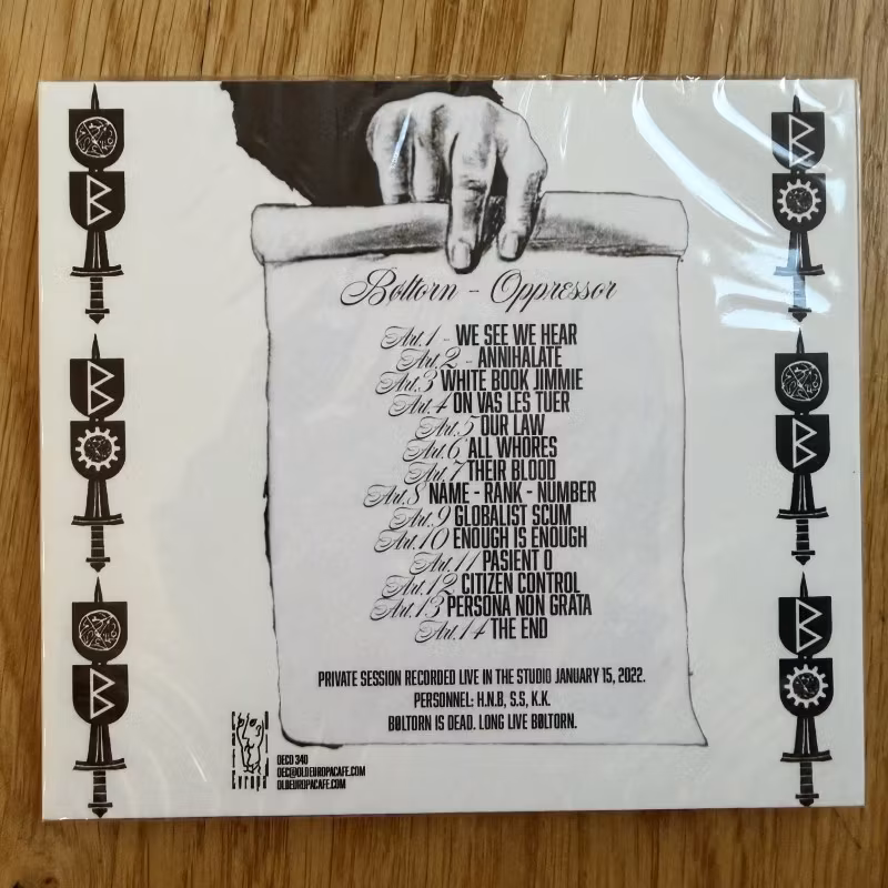 Home › NOISE, Industrial, Avantgarde › CDs › BØLTORN Oppressor (Old Europa Cafe - Italy original) (SS) CD BØLTORN Oppressor (Old Europa Cafe - Italy original) (SS) CD In stock 0 kr 100 kr CD ist still sealed.Comes in a digipak.Power Electronics from Henrik Nordvargr Björkk and co.Old Europa Cafe – OECD 340. Italy 2024. You'll probably like these as well SHEEP ON DRUGS Track X (Smash - USA original) (VG+) CDM 30 kr Info ASTRO, JAZKAMER, HAIR STYLISTICS Motorcycle Fuck With The Ghost Rider (aRCHIVE – USA original) (EX) CD 50 kr Info COLD PROPHET / K.F.R Imperilled Future (The Sinister Initiative – Sweden original) (SS) CD 100 kr Info