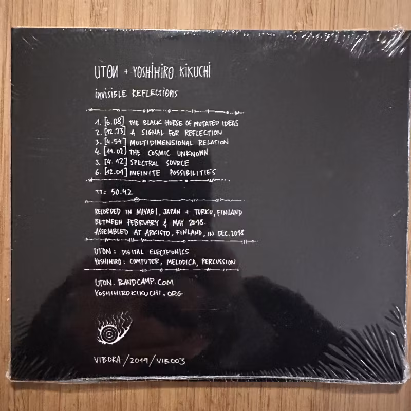 Home › NOISE, Industrial, Avantgarde › CDs › UTON+ YOSHIHIRO KIKUCHI Invisible Reflections (Vibora – Finland original) (SS) CD UTON+ YOSHIHIRO KIKUCHI Invisible Reflections (Vibora – Finland original) (SS) CD In stock 0 kr 40 kr CD is sealed.Gatefold card sleeve. Limited to 300.Finland vs Japan Noise.Vibora – VIB003. Finland 2019.
