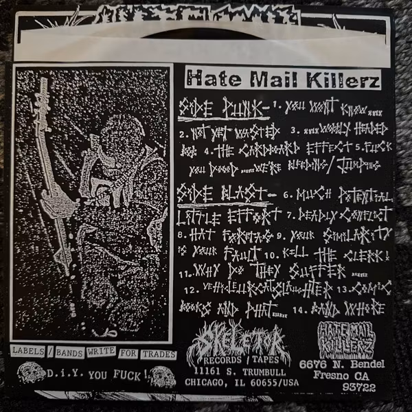 Home › PUNK, Hardcore, Oi! › HATEMAIL KILLERZ Bleeding/Jumping (Skeletor - USA original) (EX) 7" HATEMAIL KILLERZ Bleeding/Jumping (Skeletor - USA original) (EX) 7" 0 kr 30 kr Sorry, this item is out of stock. Sleeve: EX (Minor creasing.)Record: EXInsert: EXComes with insert.US Hardcore Punk.Skeletor Records – 01. USA 2001. You'll probably like these as well SPLINTER Ten Love Songs (Tenacity - USA original) (VG+) LP 40 kr Info SUBTERRANEAN KIDS No Digas (Promo) (Overdrive - Spain original) (VG+/EX) 7" 50 kr Info FORMBY CHANNEL The Inimitable (Blue vinyl) (Noise Punk - UK original) (VG+/EX) 7" 20 kr Info AMEN Feikki (Crash Mag - Sweden original) (VG+/EX) 7" 60 kr Info