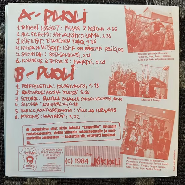 Classic Finnish Hardcore Punk compilation. With Terveet Kädet, H.I.C. Systeemi, Riistetyt, Kansan Uutiset, Sekunda, Kauneus & Terveys, Poikkeustila, Bastards, Markkinointioperaatio, Purkaus.